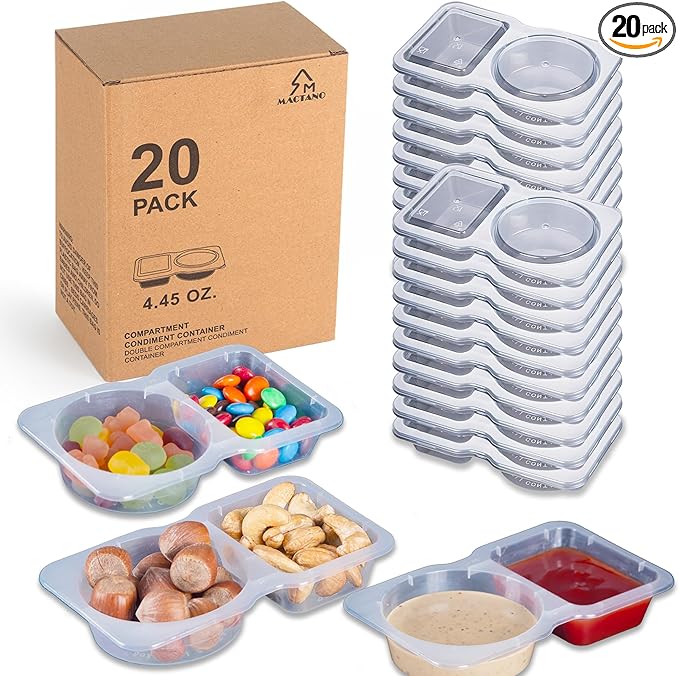 Introducing the MACTANO 20 Sets Condiment Container, your perfect partner for snacks and sauces! Priced at just $8.99, enjoy free delivery for Prime members by ordering now. These double compartment containers are not only portable but also BPA, latex, and lead-free.